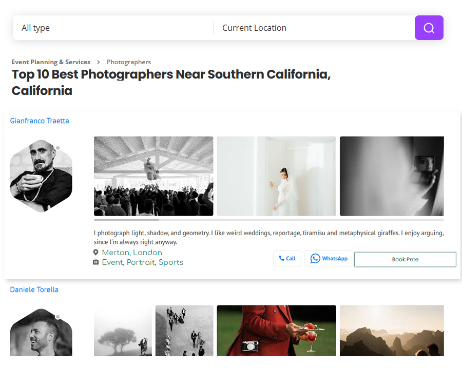 Find Best Photographers Near you Find the best photographer for your photoshoot. Filter by photography type and location to connect with top professionals. Browse their profiles, view portfolios, review details, and contact them directly